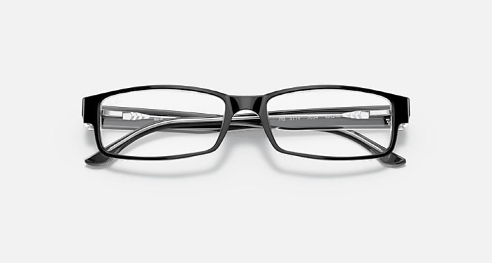 Combine elegance and simplicity with the classic rectangular design of Ray-Ban RB5114 eyeglasses. The polished black frame with transparent accents adds a contemporary flair. Made from high-quality acetate, these glasses offer a narrow fit and high bridge design for optimal comfort.