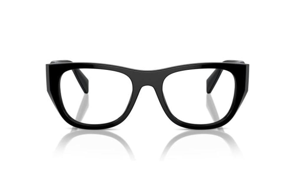 Optical eyeglasses from Prada with a black acetate pilot frame and transparent demo lenses.