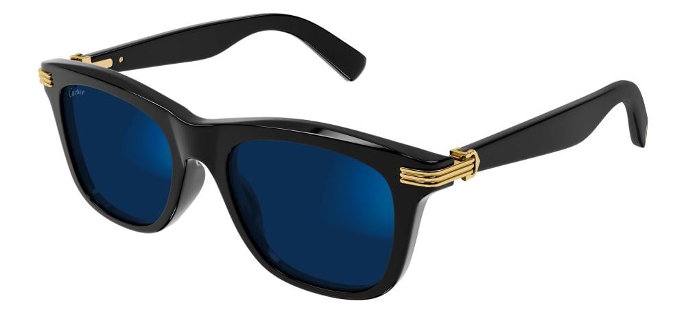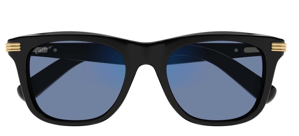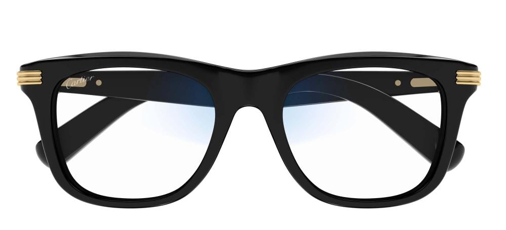 This square Cartier sunglass comes in a shiny black frame with clear to blue photochromic lenses.