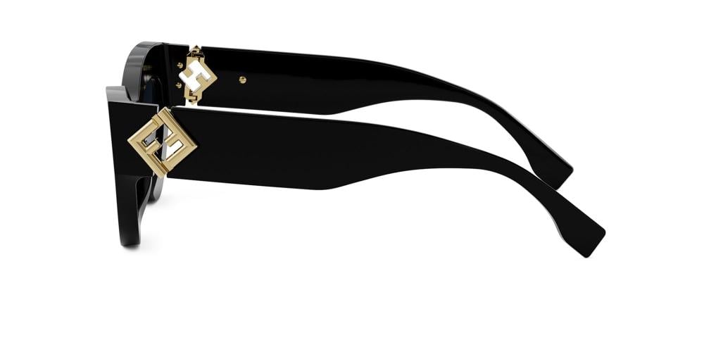 Fendi sunglasses with a cat-eye frame in shiny black and blue lenses, embodying Italian luxury and contemporary style.