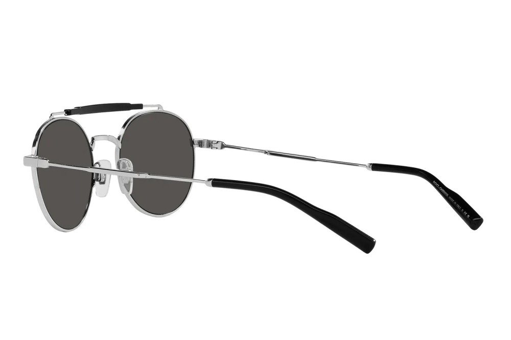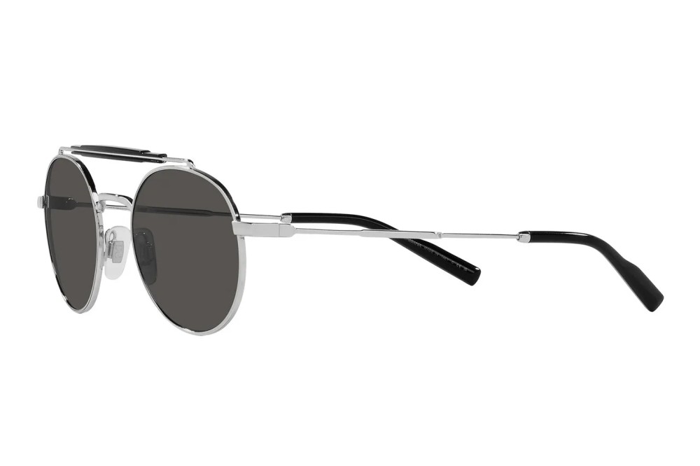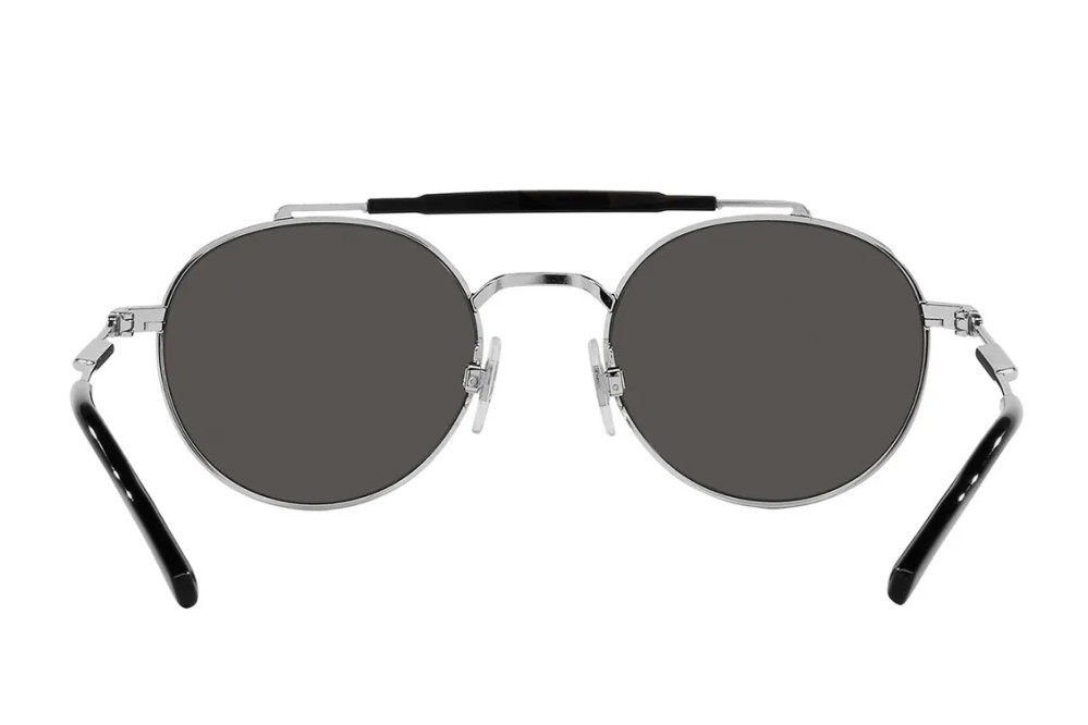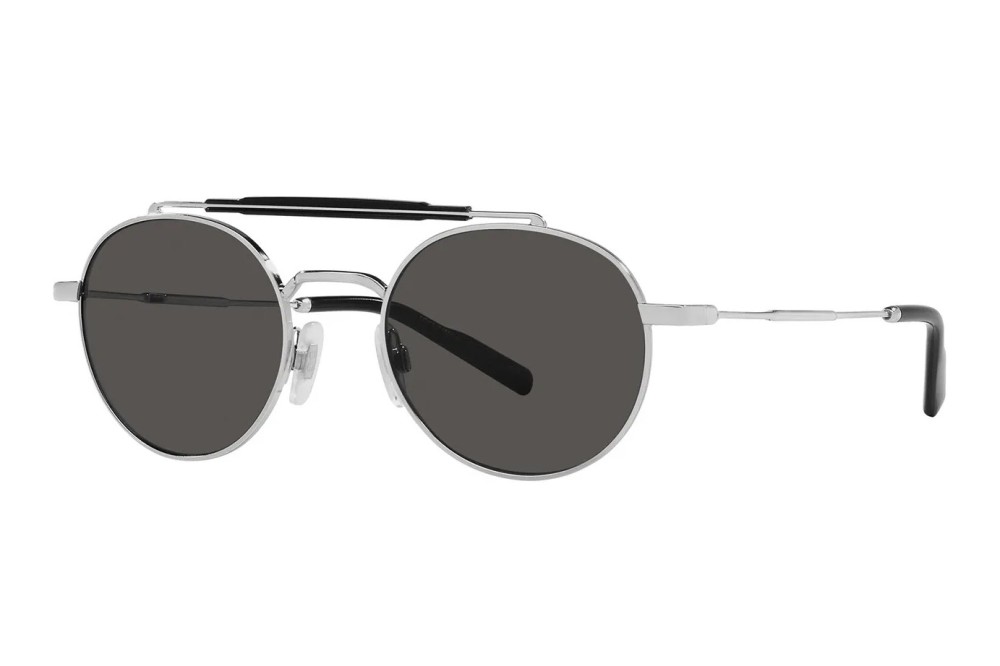 This round Dolce & Gabbana sunglass comes in a silver frame with dark gray lenses.