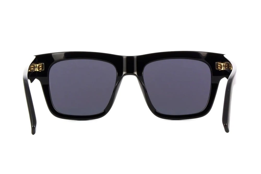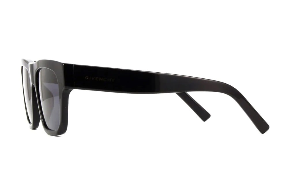 This square Givenchy sunglass comes in a shiny black frame with gray lenses.
